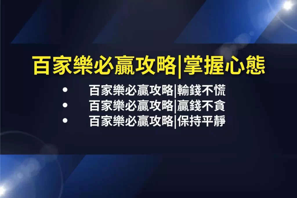 百家樂必贏攻略小編看來最重要的就是心態的部分,你會看到心態好的人基本上賺到獎金的機率就是越高,越平靜你賺的就是會越多,很簡單的道理,你看真正賺錢的人永遠都是心平氣和穩定性夠高,所以我們只要掌握心態就已經掌握好自己的財富密碼。